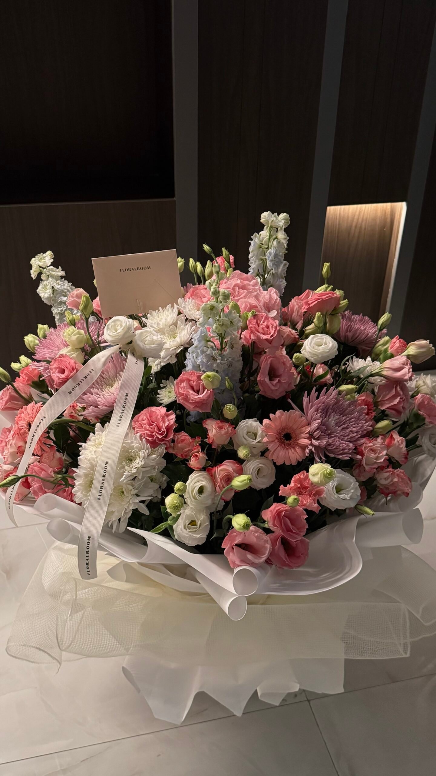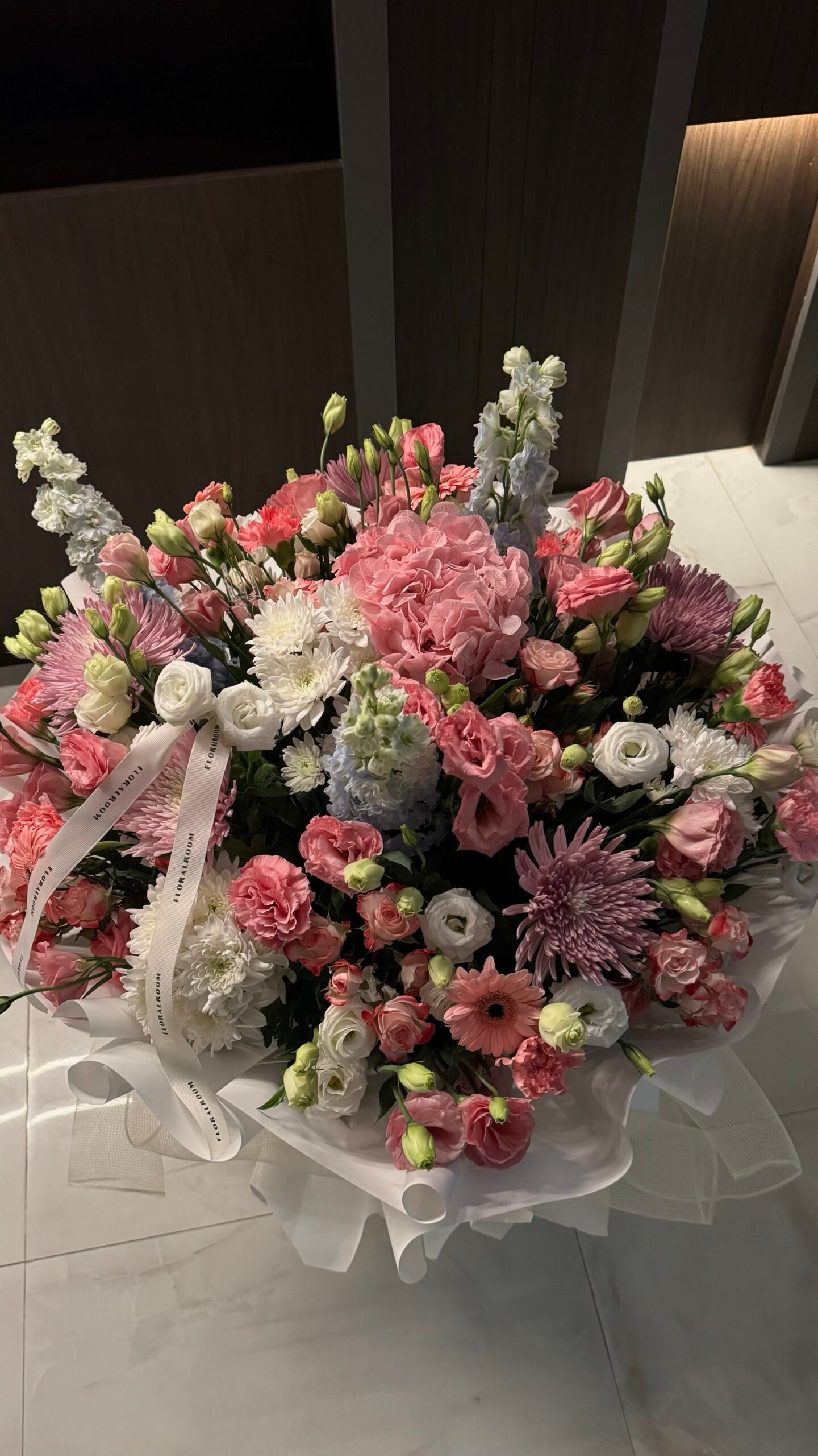 A grand, garden-inspired arrangement overflowing with soft pinks, whites, and delicate lilac tones. Crafted with a rich selection of roses, lisianthus, chrysanthemums, and seasonal blooms, this bouquet brings the beauty of a blooming garden indoors. Designed in our signature oversized wrap with airy tulle for a dreamy, refined finish.