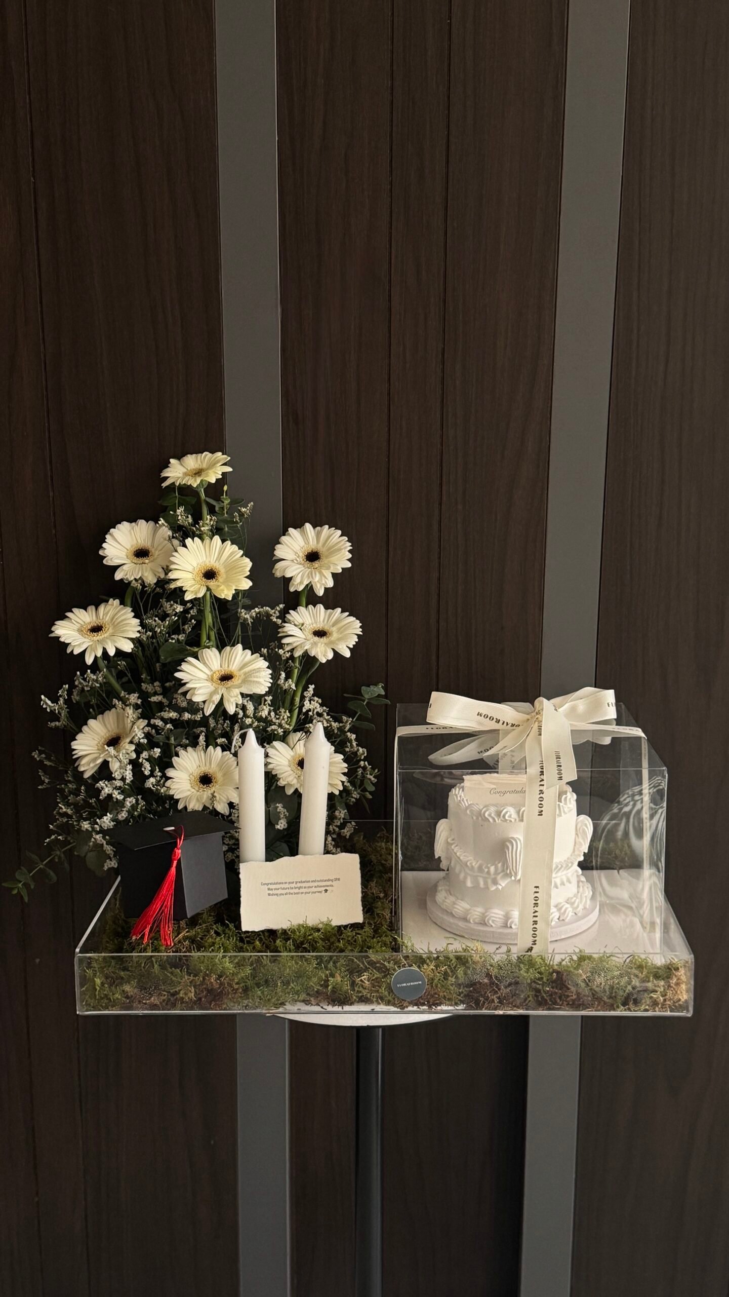Sweet success wrapped in elegance White gerberas and a delightful cake to celebrate the brightest milestones!