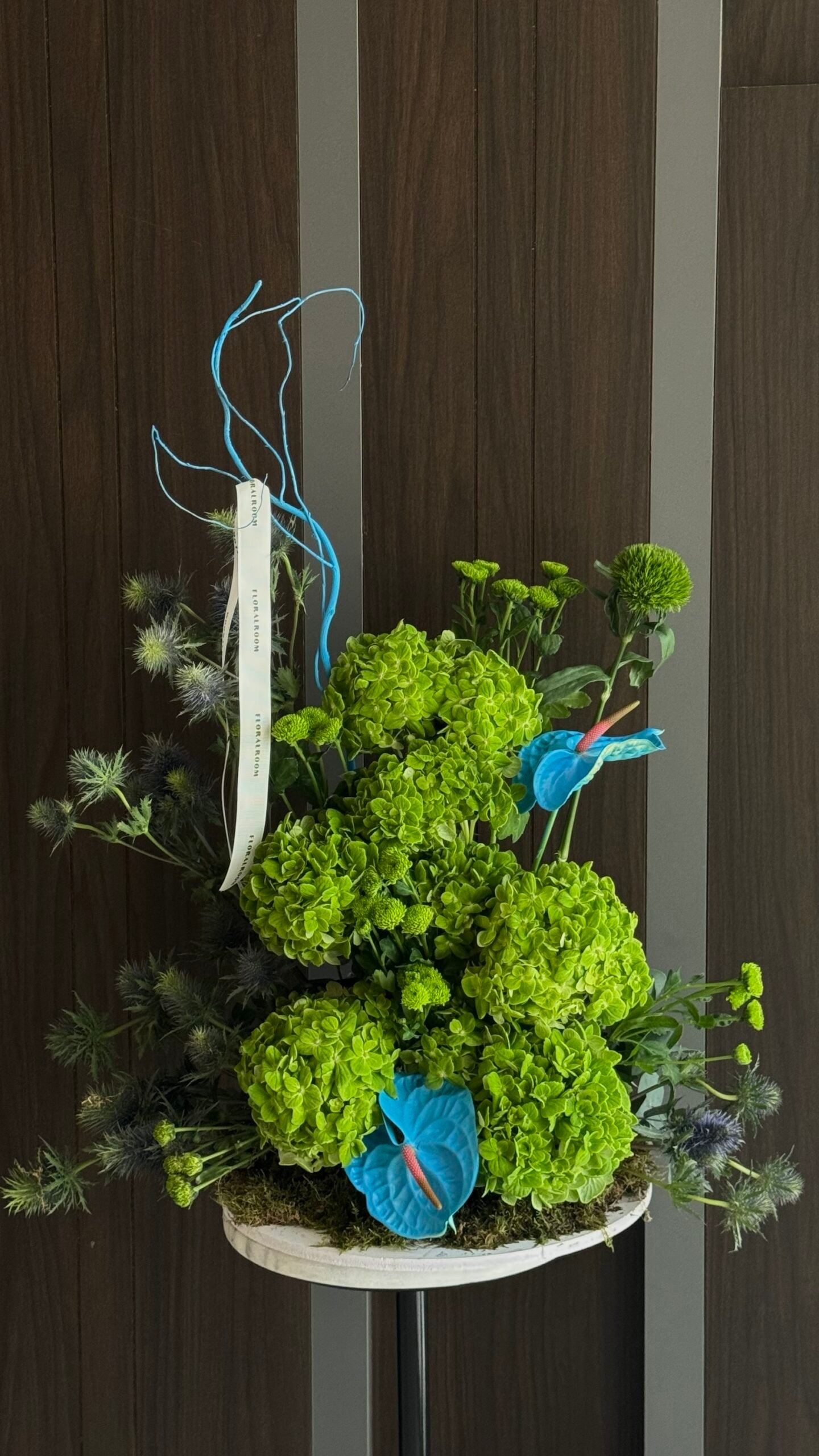 This XL centerpiece is packed with green hydrangeas, blue anthuriums, spiky eryngiums & button chrysanthemums — bold, fresh, and unforgettable!