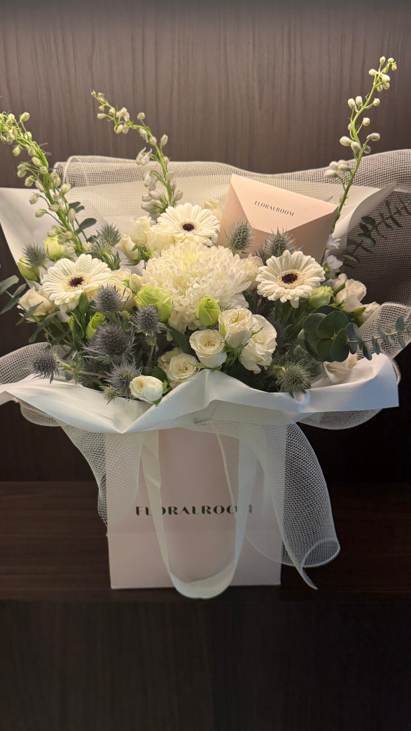 A tranquil blend of pure white blooms paired with soft greenery, “White Serenity” exudes elegance and peace. Perfect for moments of reflection, celebration, or simply adding a touch of calm beauty to any setting.